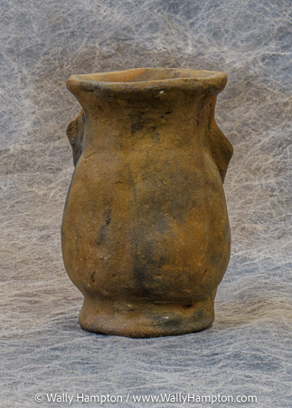 Size: 3.5 inches in diamater, 5 inches tall. Material: Fired Cl;ay (Pottery). We collected this item on our 1997 travels in PNG.