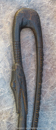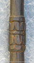 About 1 in diameter staff, 3 inches wide at handle (carved crocodile handle), 34 inches tall. Material: Carved wood. We collected this item on a trip up to PNG in 1997.
